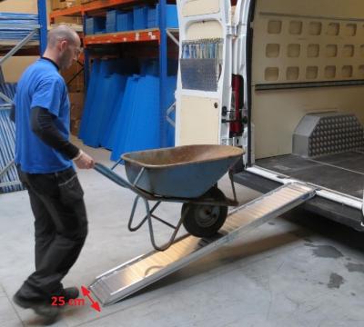Rampe de chargement en aluminium pliable en 2 parties avec bordures latérales G et D. Surface triée antidérapante. Capacité de charge : 400kg. - Longueur dépliée : 2,15m - Longueur pliée : 1,15m - largeur entre les bordures : 25cm. Poids : 12,9 Kg/ Rampe Cette rampe est vendue à la pièce (= prix affiché)